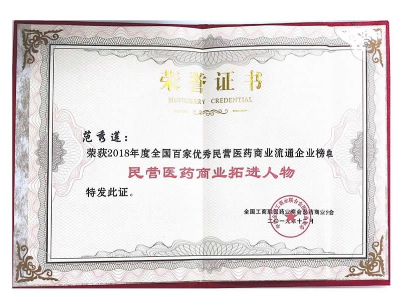 • 2018年度全国百家优秀民营医药商业流通企业榜单-民营医药商业拓展人物-范秀莲